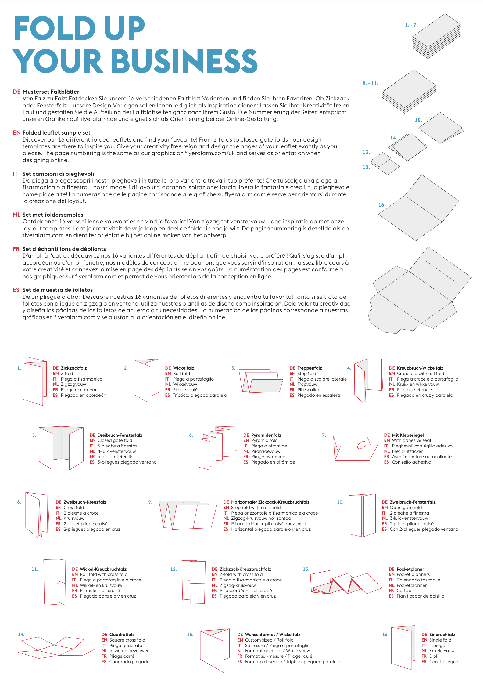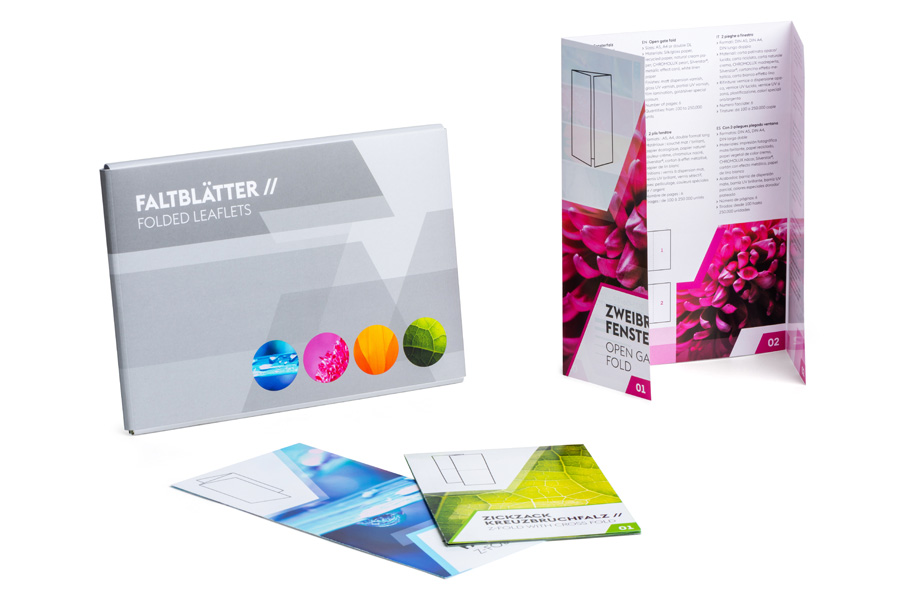 Faltblatt ist längst nicht gleich Faltblatt! Es gibt unzählige Falzarten, die sich sehr deutlich voneinander unterscheiden. Damit Sie einen Eindruck von unseren Faltblättern bekommen, haben wir in einem Papiermusterbuch zahlreiche Faltblätter für Sie zusammengetragen.